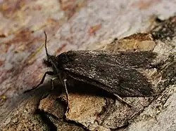 The wingspan is 6 to 10 millimetres (0.24 to 0.39 in) for females (which are not able to fly) and 17 to 20 millimetres (0.67 to 0.79 in) for males. In males, the forewings are fuscous, somewhat whitish-sprinkled; costal edge whitish-rosy; an irregular ill-defined dark fuscous transverse rather oblique fascia before middle, not reaching dorsum, and transverse mark in disc at 2/3 each preceded by a whitish suffusion. The hindwings are fuscous. In females, the forewings are grey, whitish -sprinkled; blackish oblique median and posterior fasciae. Hindwings light grey. The larvae are dull whitish-green; spots grey; head blackish; 2 with a blackish-green crescentic plate.[2]
