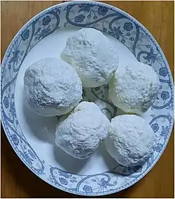 Datshi (Dzongkha:དར་ཚི;Wylie: dar-tshi) is a traditional Bhutanese cottage cheese commonly produced from cow milk. It is a naturally fermented milk product produced using the back-slopping method.[1] To make Datshi, Dahi is first prepared from raw milk, the Dahi is then processed into Mar (artisanal butter) by churning in a special wooden container called Theki. The Mar is collected and the liquid residue, called Mohi, is gently heated.[2] The heating causes casein to coagulate and the Mohi starts forming clumps. The Datshi is collected in a cloth and squeezed to eliminate extra whey and then rolled into appropriate sized cheese balls.[3]