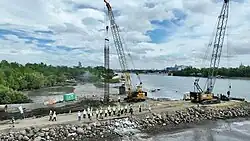Currently, the bridge civil engineering includes rebars installation for pier columns and crossbeams, scaffoldings placement prefatory to deck construction, steel sheet pile driving for cofferdam and deep foundation.[2]