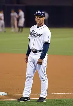 On October 18, 2010, Roberts was hired by the San Diego Padres as the first base coach replacing Rick Renteria when he was promoted to bench coach.[44] When Rentería was named manager of the Chicago Cubs after the 2013 season, Roberts once again succeeded him, named as manager Bud Black's bench coach for the 2014 campaign.[45]