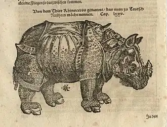 The woodcut “Rhinoceros”, for the work Cosmographia (or “Cosmography”) by Sebastian Munster, is based on the Dürer sketch.[1][2]