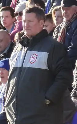 He was appointed first-team coach at Watford, but on 30 June 2011 was announced the new coach of Cardiff City, working as assistant manager to Malky Mackay.[3] Following the sacking of Mackay in December 2013, Kerslake and Joe McBride were placed in charge of the first team.[4] They were in charge until 2 January 2014, when Ole Gunnar Solskjaer was appointed as the new Cardiff City manager.[5]
