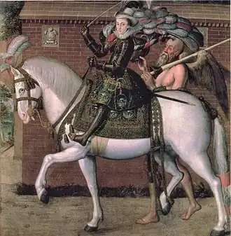 Murray installed a model of a ship made by Phineas Pett for the Prince in a private room in the long gallery at Richmond Palace in November 1607.[14] In 1609, Murray laid out £1,986 for pearls bought in London for the Prince's costume during the Christmas festivities and the Barriers tournament.[15] In March 1610, Murray organised for Robert Cecil, Earl of Salisbury, to show some pictures to the Prince, with the assistance of the Earl of Arundel.[16] The historian Roy Strong see this incident as part of the inception of the Prince's interest in European fine-art, and Murray's responsibilities came to include the Prince's cabinet of curiosities of medals and coins.