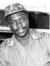 By 1971, Oyite-Ojok served as lieutenant colonel,[2] but was forced to flee his home country when Idi Amin overthrew Obote in a coup. Relocating to Tanzania, Oyite-Ojok joined the guerrilla army Obote was organizing to regain power.[1] While operating in exile, Oyite-Ojok gradually gained a "legendary" reputation in Uganda. Rumours circulated about him sneaking into the Ugandan capital where he would party with locals at popular nightspots and ask that the bills be sent to President Amin. The latter allegedly responded by putting a $70,000 bounty on Oyite-Ojok's head.[11] In 1972, Oyite-Ojok took part in a rebel invasion of Uganda which aimed at restoring Obote to presidency. Striking from their exile in Tanzania, the rebels attacked in two columns, with Oyite-Ojok reportedly leading the group targeting Masaka. However, the operation resulted in a major rebel defeat.[12][13] After this failure, Obote reorganized his remaining forces; he mobilized a "navy" of six boats on Lake Victoria which would conduct smuggling operations to finance the rebels as well as set up an underground network in Uganda. Oyite-Ojok was entrusted with command of Obote's "navy".[14]