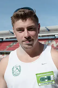 The following year he competed with the 6 kg junior implement and won the shot put title at the 2008 World Junior Championships in Athletics with a mark of 21.08 m, which made him the fourth-best junior of all time.[1] In 2009, he began using the full senior weight (7.26 kg) in the indoor season and achieved a best of 19.48 m. Returning to the junior 6 kg shot in the outdoor season, he became the first ever junior athlete to throw beyond 22 metres in Mannheim, setting consecutive world junior records of 22.18 m and then 22.34 m.[3] A month later he increased this mark to 22.73 m in Osterode (putting some distance between himself and the Edis Elkasevic's former record of 21.96 m),[4] and went on to win the 2009 European Junior title with a championships record of 22.40 m.[5] Having placed third at the 2009 German Athletics Championships and achieved the senior international "A" standard with a personal best throw of 20.43 m, he was selected for the 2009 World Championships in Athletics in Berlin. He ended his first senior international appearance in 15th place in the qualifying rounds.[6]