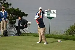 The standout year of Toms' career came in 2001. He had nine top-10 finishes and three wins on tour, one of which was his first major championship.[5] Toms won the Compaq Classic of New Orleans by two strokes over Phil Mickelson for his fifth PGA Tour title. That summer, Toms won a major, the PGA Championship, by one stroke over Mickelson. His winning score of 265 in the 2001 PGA Championship was the lowest absolute 72-hole score ever recorded in a major championship, until Henrik Stenson shot 264 in the 2016 Open Championship.[4] Toms followed up his first major win by successfully defending his title at the Michelob Championship at Kingsmill.[6] At the last event of the year, Toms entered a four-man playoff at The Tour Championship where he, Sergio García and Ernie Els lost on the first extra hole to Mike Weir.