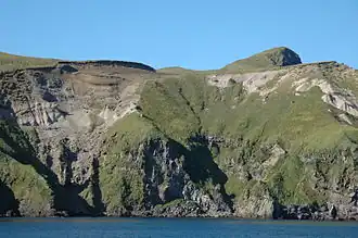 Davidof island is believed to be part of a circular complex of island remnants of an ancient twin-coned volcano that was destroyed in a catastrophic eruption during the late Tertiary period — Davidof, and its smaller companions Lopy and Pyramid Islands, are remnants of the ancient caldera rim while Khvostof Island is a remnant of the western portion of the cone. Davidof Island has steep rocky shores that rise to an interior plateau to a maximum elevation of 328 m). Much of its coastline comprises steep slopes or beaches of boulder and pebbles while Crater Bay coast on the southwest contains sandy beach.[3]