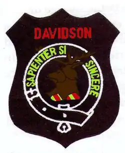 While at Killarney Heights High School in 1972, the parents of the first students were granted permission by the Lairds of the Clan Davidson to assume the crest badge, motto, and tartan of Clan Davidson of Tulloch in Scotland.[2] The arms of Davidson of Tulloch were matriculated to Duncan Davidson (1865–1917) by grant of the Court of the Lord Lyon on 12 April 1906.[19] The clan's distinctive tartan colours, motto, and the stag's head crest were incorporated in the school badge, which took the form of an ornate shield with the school name. The Davidson of Tulloch and original Davidson High motto (enclosed within a heraldic belt) – Latin: Sapienter si Sincere – means 'Wisely if Sincerely' or alternately, 'with wisdom if with sincerity'.[2][20]