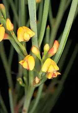 Daviesia apiculata is an erect, bushy, glabrous shrub that typically grows to a height of 0.4–1.5 m (1 ft 4 in – 4 ft 11 in). Its leaves are reduced to erect, cylindrical phyllodes 25–60 mm (0.98–2.36 in) wide and about 1.5 mm (0.059 in) wide with a more or less sharply-pointed tip. The flowers are yellow with a red tinge, arranged in groups of four to six in leaf axils on a peduncle 1–3 mm (0.039–0.118 in) long, each flower on a pedicel 1–2 mm (0.039–0.079 in) long with oblong bracts at the base. The sepals are 3.0–3.5 mm (0.12–0.14 in) long, the two lobes about 0.5 mm (0.020 in) long and joined in a broad "lip" and the lower three smaller and triangular. The standard petal is elliptic with a notched tip, 4.0–4.5 mm (0.16–0.18 in) long, the wings oblong and about 4.5 mm (0.18 in) long and the keel 4.0–4.5 mm (0.16–0.18 in) long. Flowering mainly occurs from November to May and the fruit is a triangular pod 14–15 mm (0.55–0.59 in) long.[2][3]