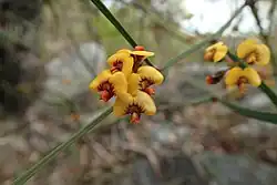 Daviesia wyattiana, commonly known as long-leaf bitter-pea,[2] is a species of flowering plant in the family Fabaceae and is endemic to eastern Australia. It is a sparse, erect shrub with long, linear phyllodes, and groups of four to seven yellow flowers with red or purplish markings.