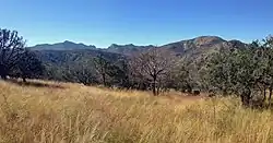 Mixed in with the grassland, and usually at higher elevations, are four woodland and forest zones. First, at elevations below 1,900 m (6,200 ft) and at higher, drier elevations, the dominant tree species is the alligator juniper mixed with oak species and pinyon pine. Secondly, woodlands with pinyon pine as the most common species are found on steep slopes at elevations of 1,750 to 2,400 m (5,740 to 7,870 ft). Third, woodlands in which the gray oak is the most common tree and mixed with other oak species are also found on steep slopes at elevations of 1,900 to 2,400 m (6,200 to 7,900 ft). The gray oak woodlands are found in slightly moister soils than the pinyon woodlands.[4]