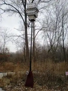 Dawnsong is a kinetic sculpture that serves as an interactive bike rack. A steel obelisk with a hand-crank on it juts upwards with a birdhouse resting on the top. The aluminum bird house has multiple holes throughout its multiple "stories." When the hand-crank is turned the house expands and contracts slightly. The sculpture is placed at the Efroymson Canoe Launch area along the White River near the Monon Trail.[1]