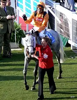 Daylami sired the winners of more than four hundred races. The best of his progeny was Grey Swallow, winner of the 2004 Irish Derby and 2005 Tattersalls Gold Cup. His other notable offspring included Voila Ici (Premio Roma, Gran Premio di Milano), Indian Days (Bosphorus Cup x2) and the hurdler Zaynar (Triumph Hurdle).[51] He was pensioned in 2014 and was euthanized on 5 April 2023 due to infirmities of old age.[52]
