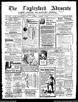 1. ^ "AustLit". The Daylesford Advocate and Hepburn, Glenlyon, and Blanket Flat Chronicle. AustLit. Retrieved 12 February 2015.