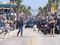 Daytona Beach Bike Week, also called Daytona Bike Week, is a motorcycle event and rally held annually in Daytona Beach, Florida. Events occur throughout Volusia County, including the DeLand Bike Rally in Downtown DeLand on the first Saturday of Bike Week and other events in DeLeon Springs. Over 400,000 people make their way to the rally area for the 10-day event.[1] The festivities include motorcycle racing, concerts, parties, and street festivals. The event is usually held on the first full week of March (including the Fri-Sat-Sun prior to) and contends with the Sturgis Motorcycle Rally as the most popular motorcycle rally in the United States.[2][3][4][5][6]