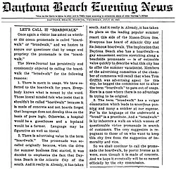 At its conception the Boardwalk was originally called "the Broadwalk" as it was a broad stretch of cement, and not boards. Many references can be found referring to the attraction as Broadwalk. The common name became the Boardwalk after the editor of the local newspaper committed to calling it that in the newspaper, and it caught on. The editor was concerned with the advertising value of the term Boardwalk over Broadwalk (as Daytona at that time was looking to market as the Atlantic City of the South), as well as the "vulgar connotation" of using the term "broad" in relation to women who may be walking there.[5]