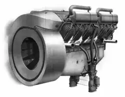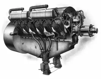 The propeller shaft was geared down from the crankshaft by spur gears and rotated at half the engine speed. The intake and exhaust valves were controlled by a single camshaft, which was placed between the two rows of cylinders. The camshaft was connected to the propeller shaft and therefore also rotated at half speed of the crankshaft.