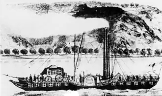 On 22 September at 11 am De Rijn left Kehl for Mainz.[13] On the return journey, there was a pleasure trip at Mainz on 24 September. It was attended by about a hundred people. These were primarily merchants, members of the Central Commission for Navigation on the Rhine from Mainz, and officials from the governments, the military, and the chambers of commerce. After dinner, the Austrian garrison's band provided the ball's music.[14] On 27 September De Rijn arrived back in Köln.[15]