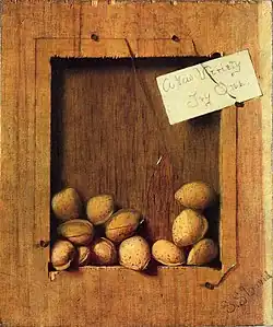 During his life, he was mainly known for his genre paintings and portraits of stylish young women in rich settings.[1] His popularity faded after his death, until a number of trompe-l'œil still lifes were attributed to him.[1] Evans is known to have signed his work as D. Scott Evans and later De Scott Evans, and some of the still lifes attributed to him bear the names David Scott, S. S. David, and Stanley S. David. The attributions are not without question, but are assumed based on the similarity of two paintings of pears, and scholars' inability to identify another artist named "David" who was active at the right time and place.[1]