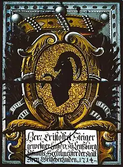 In 1714, King Frederick William I of Prussia gave the hereditary title of Baron and a coat of arms to the "black" de Steigers, including Christoph,[6] eight de Steiger males, and their descendants.[9] They would have baronies in Montricher and Monnaz, in Vaud, and numerous estates in Bern.[10][11] Their coat of arms still appears today on the walls of the Château de Chillon. Niklaus is buried in a cathedral in Bern.[8]