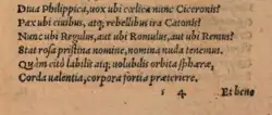 The metre of this poem is no less remarkable than its diction; it is a dactylic hexameter in three sections, with mostly bucolic caesura alone, with tailed rhymes and a feminine leonine rhyme between the two first sections; the verses are technically known as leonini cristati trilices dactylici, and are so difficult to construct in great numbers that the writer claims divine inspiration (the impulse and inflow of the Spirit of Wisdom and Understanding) as the chief agency in the execution of so long an effort of this kind. The poem begins: