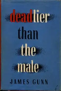 Deadlier Than the Male is a 1942 crime novel by the American writer James Gunn.[1] It was the only published novel of Gunn, better known as a screenwriter.[2] While in Reno to gain her divorce Helen Brent discovers the bodies of two people murdered by Sam Wild. A few days later Wild meets and swiftly marries her wealthy sister Georgia.