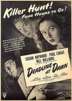 Deadline at Dawn is a 1946 American film noir, the only film directed by stage director Harold Clurman. It was written by Clifford Odets and based on a novel of the same name by Cornell Woolrich (as William Irish). The RKO Pictures film release was the only cinematic collaboration between Clurman and his former Group Theatre associate, screenwriter Odets. The director of photography was RKO regular Nicholas Musuraca. The musical score was by German refugee composer Hanns Eisler.