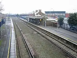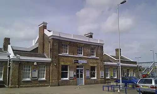 The original single platform with its 2-storey 1847 building became the new 'up' platform. This line now continued south under a new flyover carrying London Road and necessitated demolition of the middle houses in Sunnyside Terrace. The siding next to this was extended to become a through siding. Finally, a new 'down' platform was built to the west with buildings similar to those at Walmer. The existence of this middle siding explains the gap between the current tracks. The footbridge, which originally had a roof, also dates to 1881.[3][4][5]