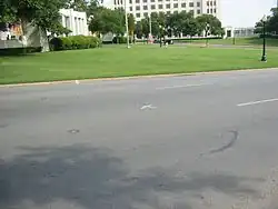 - Kennedy assassination site, Elm St. between N. Houston St. and the Triple Underpass – Although it is occasionally removed, a white "X" on the Elm St. pavement usually marks the spot where President Kennedy was fatally shot.[10]