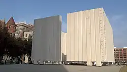 - Kennedy Memorial and Plaza, 600 Main St. – The Kennedy Memorial and Plaza is located between Main St. and Commerce St. west of S. Market St. The 1969 memorial is located within the middle of a plaza on the eastern half of a double block it shares with the former county courthouse due to the previous closure of Record St. The memorial plaza sits above an underground parking structure and includes trees and benches around the memorial. The Kennedy Memorial is a cenotaph designed by architect Philip Johnson featuring a 50-by-50-foot (15 m) open space with 30-foot (9.1 m) vertically scored concrete walls. Two narrow openings extend to the top in the middle of the north and south walls. In the center of the memorial is a square 8-foot (2.4 m) black granite slab with the president's name engraved in gold.[3]: 26
