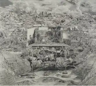 Writers suggest that Byington's later paintings explore historical and sociopolitical themes in a more expansive, cinematic manner in terms of vastness (their large scale and God's-eye views), sweeping subjects (climate change, terrorism, urban sprawl) and time (a sense of layer centuries of history including the potential future).[6][2][38] These paintings blur notions of urban and rural, ancient and modern, piling intractable ambiguities and compressed, distressed and fragmentary realities into monumental landscapes, geologic formations and industrial sites suggestive of post-human or post-apocalyptic, possibly alternate civilizations (Omphalos, 2011).[18][29][9][39] SquareCylinder described the maze of cellblock-like huts, scaffolding and brickwork in the black-and-white landscape Divided City (2015) as "an unending public works project … depict[ing] a mismanaged future, an allegory of Big Plans and half-starved dreams."[40]