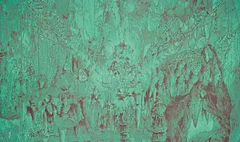 As the decade progressed, Byington pushed the horror vacui sense of density in the work and also began creating color canvasses that suggested mysterious minimalist monochromes in which his signature imagery appeared as if seen through an aquarium or fog (e.g. Underground #1, 2006; Waterfalls 2010);[5][32][27] The New Yorker described them as "glazed in candy-colored pink, green, or robin’s-egg blue, like Easter eggs—or blotter acid."[37] This work included the green "Underground" series, which featured with geologic forms: stalactites, stalagmites, minerals, gems, and cave-like openings into various spaces.[21]