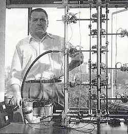Dean made a demonstration for a representative of the magazine Popular Mechanics of one of his "Dean drive" devices. The witness reported that "While suspended above the ground, was able to pull a load to itself without itself being pulled toward the load".[2] Another version of the machine was reported to be "able to apply a force to a hand, without moving—yet when the machine was turned off an equivalent force applied by the hand easily moved the machine".[3] William O. Davis, who witnessed the latter demonstration, wrote in his notebook about Dean's explanation of how the device worked, "... does not strike me as valid ... For this reason I have decided to undertake a theoretical study of dynamic systems to see if a concept can be evolved which will describe a world in which Dean's Drive can exist and yet where other known facts are not contradicted."[3] Davis produced a hypothesis, and it was published in Analog in 1962.[14]