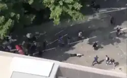 The fight between the two groups broke out at 11.52 am.[3] It involved members of both sides hurling bricks at each other.[3][10][12][15] The protesters were dressed in black,[6][8][12] wore masks over their faces,[6][14][33] and carried umbrellas used as protection during the fight.[34] The incident lasted for about a minute,[3][12] after which the protesters retreated under the shelter of their umbrellas.[3][12][22]