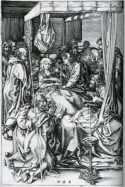 Van der Goes was a highly progressive and original artist. The inspiration for the painting is evident in Petrus Christus' c 1457–67 Death of the Virgin[5][11] and by works attributed to the workshop of Rogier van der Weyden.[12] Van der Goes's version bears many similarity to Martin Schongauer's c 1470–75 engraving of the same name, especially in its tone and mood, the depiction of Mary and the representation of the apostles seated to Mary's left. Yet there are significant differences; the bed in Schongauer's engraving is canopied and the distribution of the apostles is very different in the two works. The Schongauer is dated to at least 1475, and it is a matter of significant and at times harsh and divisive critical debate as to which work came first (see above).[12]