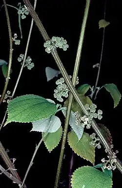 The inflorescences occur in the leaf axils and consist of clusters of very small flowers - male flowers are about 1 mm (0.04 in) long while female flowers are about 0.5 mm (0.02 in) long. The fruit is an achene about 0.7 mm (0.03 in) long.[4][5]
