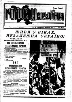 The Act of Declaration of Independence of Ukraine[a] was adopted by the Supreme Soviet of the Ukrainian SSR (Verkhovna Rada) on 24 August 1991.[1]