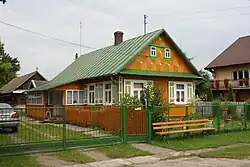 In the Podlachia region, especially in the Bielsk and Hajnówka counties, wooden residential houses are often architecturally decorated in their own style.[1] At the beginning of the 20th century, village buildings were still built according to the spatial layout of the Volok Reform that had been established since the 16th century. This tradition also included the layout of rooms and the shapes of buildings. The oldest preserved, decorated wooden houses in Podlachia date back to the beginning of the 20th century. The oldest ornaments preserved to this day date back to the years 1920–1940 and sometimes to the period up to the 1960s.[2]