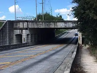 ![]() US 17/92 passing under what remains of the Haines City Branch in Haines City. The structure once held multiple tracks but today only carries the one remaining track and a multi-use path. | |||