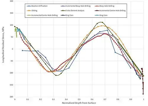 For example, a beam component was plastically bent to introduce a known residual stress profile.[12] These residual stresses were then measured using multiple residual stress measurement techniques including Neutron Diffraction,[13] Slitting,[14] Ring Core,[15] Incremental Centre Hole Drilling,[2] Deep Hole Drilling and Incremental Deep Hole Drilling, as well as modelled with finite element software to provide further numerical validation. The correlation between the results from techniques is strong, with DHD and iDHD displaying the same trend and magnitudes as both the numerical simulation and the other experimental techniques. The results from this comparison are shown in the Figure.
