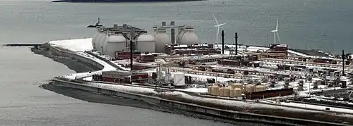 Wastewater from the 43 communities in the Boston area served by the MWRA reaches the plant through four tunnels. Three pump stations with a combined capacity of 1270 million gallons per day (mgd) lift the wastewater about 150 feet to primary treatment clarifiers that use gravity to remove about half of the pollutants. The next stage, secondary treatment, uses pure oxygen to activate microorganisms that consume organic matter. Deer Island cryogenically generates 130 to 220 tons of oxygen per day for this purpose. Sludge and scum from the primary and secondary treatment stages are thickened and fed to twelve 130 foot high egg-shaped digesters. Methane gas produced by the digestion process is burned to make steam which is fed to a turbine that generates about 3 megawatts of electricity and provides heat for the treatment processes and keeping buildings warm. (Additional on-site power began generation by two 600 kW wind turbines in 2009).[12] Digested sludge is then sent across the harbor via a tunnel to a pelletizing plant at the Fore River Shipyard in Quincy. The output is sold as fertilizer and shipped to customers by rail and truck.[13]