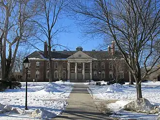 As Deerfield grew more prominent, it moved away from its public-school roots. Academic James McLachlan said that Boyden built "an essentially new and different institution [] on a moribund foundation."[27] In Boyden's early years, Deerfield "w[as] comparatively inexpensive, drew [its] students from a broader social spectrum, and imposed a less Victorian regimen" than Episcopal Church schools such as St. Paul's, Groton, and Kent.[28] By 1928, 30 out of Deerfield's 185 students were on scholarship, and as a further democratizing measure, the scholarship students' identities were kept secret.[29] However, the academy's rising reputation also attracted the attention of major donors from around the country, including Nelson Rockefeller and John Gideon Searle, who sent their children to Deerfield.[30] By 1940, Deerfield was charging higher tuition than even St. Paul's and Groton,[31] and as many as 75% of Deerfield students had attended private middle schools.[32] (The latter fact displeased Boyden, and by the 1960s the academy boasted that 75% of its incoming students had attended a public school.[32]) Deerfield also discontinued coeducation in 1948, after educating girls for over 150 years.[33]