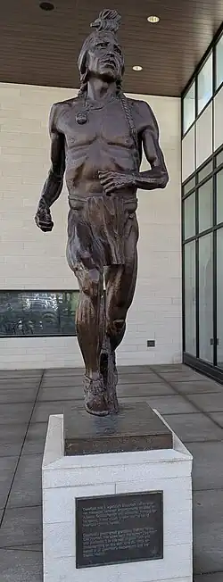 Disillusioned and disappointed with the corruption involving the gambling group The Syndicate, Deerfoot parted ways with his team in 1886 and began running as an independent with mixed success.[11] Deerfoot died in 1897 of tuberculosis in the NWMP guardhouse at Fort Calgary and is buried in an unmarked grave in Calgary.[12][3][13]