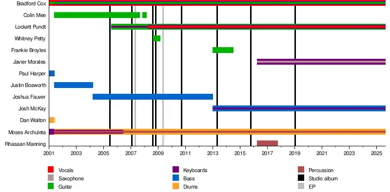 Former bass guitarist Joshua Fauver died in November 2018 at age 39.[29] He was a member of the band from 2004 to 2012.