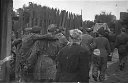 On August 6, from the early hours, the cemeteries and the barricade at the intersection of Żytnia and Młynarska streets were shelled by German tanks, artillery, and the guns of armored train No. 75, moving along the perimeter railway line. The enemy fire soon forced the front-line subunits of the Parasol Battalion to retreat from the intersection to the cemetery grounds. Among those killed was courier Krystyna Wańkowicz (codenamed Anna) – the daughter of Melchior Wańkowicz.[42] During an inspection of forward positions, the commander of the Parasol Battalion, Captain Adam Borys (codenamed Pług), was severely wounded (he was replaced by Second Lieutenant Jeremi).[43] At 6:00 AM, the German police attacked Radosław's southern flank along the entire sector from Młynarska Street to Kercelego Square. Two and a half hours later, a frontal assault by the 608th Guard Regiment on the Calvinist cemetery began. The attack from the south was temporarily halted by the Poles along Żytnia Street. However, on the western sector, the Germans managed to penetrate the Calvinist cemetery. A counterattack by the Parasol Battalion momentarily stopped the enemy's advance there but failed to push the Germans out of the necropolis walls. During the cemetery fighting, the commander of the 2nd Company of Parasol, Officer Cadet Stanisław Jastrzębski (codenamed Kopeć), was seriously wounded. Meanwhile, German artillery fire broke through the wall of the adjacent Evangelical cemetery. Pressured heavily by the enemy, Parasol companies had to retreat deeper into the cemeteries and organize a defense within the maze of graves.[44] With the looming threat of the Germans capturing the Wola artery, the Home Army Main Command, along with the Government Delegation for Poland and the close protection platoon, evacuated from Wola, setting up a new headquarters at the school on Barokowa Street in the Old Town.[45][46] Following them, units of the Paweł Group also moved to the Old Town, and at night, the remnants of the People's Army units.[47] Unarmed soldiers were dismissed from the ranks. These events severely weakened the cohesion of the Polish defense. By 4:00 PM, the Calvinist and Evangelical cemeteries were captured by the Germans, and their defenders were pushed back to Okopowa Street. Threatened with encirclement from the north, the Parasol and Pięść subunits were also forced to withdraw from Młynarska Street and the Gizów colony towards Okopowa Street.[41][48] The enemy was satisfied with these successes and did not continue the assault towards the Jewish cemetery and Okopowa Street.[49]