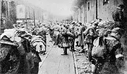 On the evening of August 10, the Radosław Group began evacuating the wounded and prisoners to the Old Town using captured vehicles. This evacuation was carried out under difficult conditions, through the rubble of the ghetto and under fire from German positions. However, the main forces of Kedyw were still holding in the Okopowa Street area.[97] Meanwhile, from dawn on August 11, the Germans heavily shelled the insurgent positions. The shelling was conducted by mortars, grenade launchers, and a battery of five guns from Wola, as well as by the armored train's artillery.[93] At 4:00 AM, Lieutenant Witold's company was forced to abandon the barricade at the intersection of Ostroroga and Młynarska streets. At 8:00 AM, a powerful German assault began from Młynarska Street and the Catholic cemetery, encompassing the entire Broda 53's sector from Gęsia Street to Spokojna Street. The Germans used Goliaths for the first time in this sector, with one of the mines being disabled by Lieutenant Mały. After an hour of fighting at the Jewish cemetery, the enemy approached assault distance to the Polish positions on Okopowa Street. The central point of Broda's defense became the "fortress" in the St. Kinga school at 55A Okopowa Street and Pfeiffer's tannery. Polish positions in the camp on Gęsia Street were also attacked from the direction of Pawiak.[98][99] The greatest threat emerged on the northern flank of Radosław Group. The German 608th Security Regiment, supported by assault guns and anti-tank guns towed by infantry, conducted a strong attack towards Parysowski Square and Stawki, defended by the Czata 49 Battalion and a platoon from the Pięść Battalion. Around 9:00 AM, the Germans launched a sudden assault, capturing the warehouses and pushing the defenders back to Muranowska Street. Only Captain Sawa's unit held its positions on Dzika Street. The Germans also attacked the positions of the Leśnik Group, capturing the Customs Office building, although the remaining posts were held by the Poles. Radosław's units were at risk of being cut off from the Old Town.[99][100]