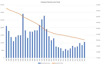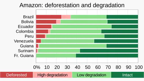 By the year 2022 around 26% of the forest was considered as deforested or highly degraded.[3] According to the Council on Foreign Relations, 300,000 square miles have been lost.[4]