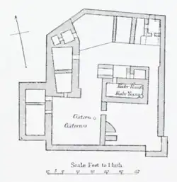 The ruin, surrounded by a quadrangular wall structure and vaulted rooms, consisted of a single cell chapel and semi-circular apse.[1]