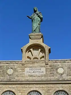 The monastery was established in 1927, under the then British Mandate of Palestine, by the Latin Patriarch Luigi Barlassina and contained a boarding school, an orphanage and convent. Currently the convent is running a guest house and a retreat center for believers and Holy Land pilgrims. The façade of the convent church bears the Latin inscription "Reginæ Palæstinæ", lit. "to the Queen of Palestine", and carries a 6-metre statue of the Virgin Mary. The church ceiling is decorated with a painting showing angels carrying banners with the first words of the Hail Mary prayer in 280 languages.[2][3] Since 2009, the convent is in the care of the female branch of the Catholic order known as "the Monastic Family of Bethlehem, of the Assumption of the Virgin and of Saint Bruno", called the monastic Sisters of Bethlehem.[2]