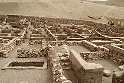 The community of artisans at Deir el-Medina worked on the construction and decorations of the royal tombs. The town was home to the workers and their families for roughly 450 years, beginning with the 18th Dynasty until the end of the 20th Dynasty.[3] The workers were divided into various roles. The chief workman directed the workers and represented them as a group in any dealings with the authorities; they were approached concerning community legal matters, settled disputes, and received correspondence from the vizier.[4] Deputies, four to each work group, acted as a member of the court (the Kenbet) and witnessed both legal and commercial interactions. The deputies also participated in investigated and inspections, especially those associated with strikes. Scribes, second in rank only to the chief, were responsible for the administrative progress of the tomb, for maintaining order, and were expected to encourage the artisans to return to work during the strikes; they reported directly to the vizier.[5] The "captains of the tomb", a group of scribes and chiefs, wielded collective authority over the tomb and jointly distributed both grain rations and material for the workers; they were also responsible for the workers' behaviour and bringing them back to work from strikes.[6] The workers were provided with male serfs, who received payment in grain from the scribes, and also with groups of women slaves, who were provided by the king to grind the workers' grain payments into flour on the grindstones in the village.[7]